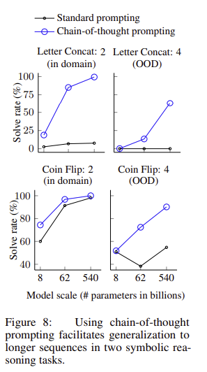 - standard prompting와 달리 CoT prompting은 in-domain 뿐만 아니라 OOD 문제도 잘 해결