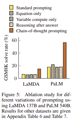 - 이 경우 Standard prompting과 유사한 성능을 보임. CoT prompting이 단순한 정보 추가의 측면이 아닌 논리 전개 과정을 학습하는데 도움을 주어 성능을 향상시킴을 의미